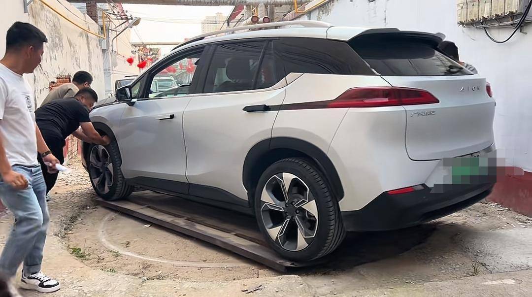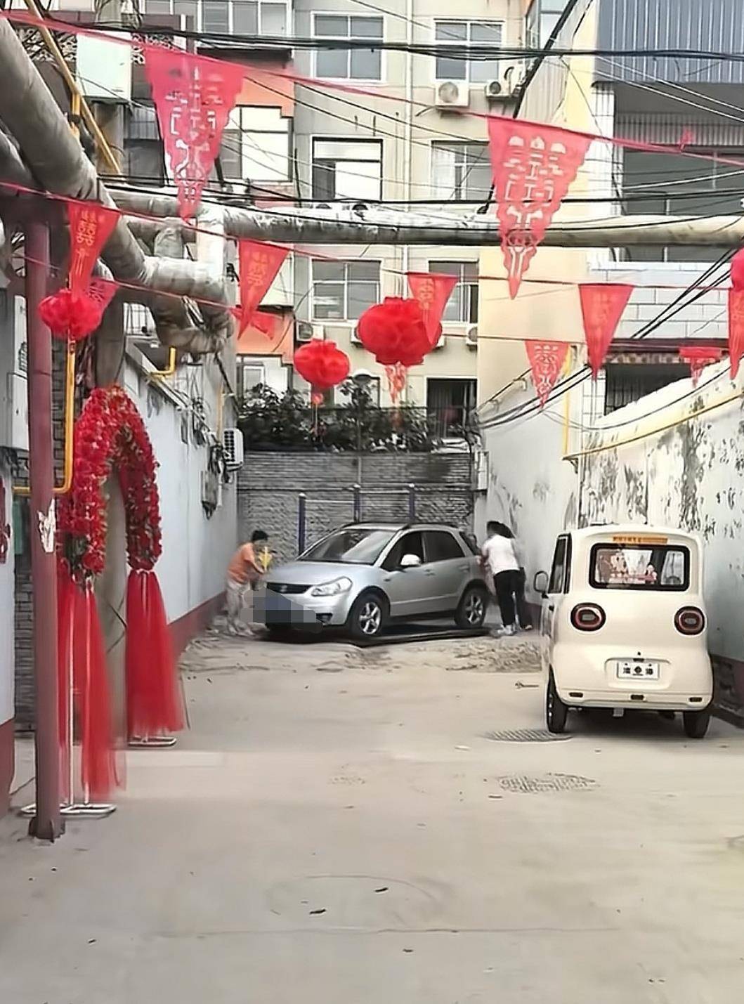 网友拍摄的视频显示,在居民楼附近的长胡同内,三人正在推一辆停放的汽车原地掉头。其中,一名男子和一名女子用手推车尾,另一名男子推车头。记者注意到,车辆底部的地面有一个圆形转盘,车辆跟随着转盘一起转向。